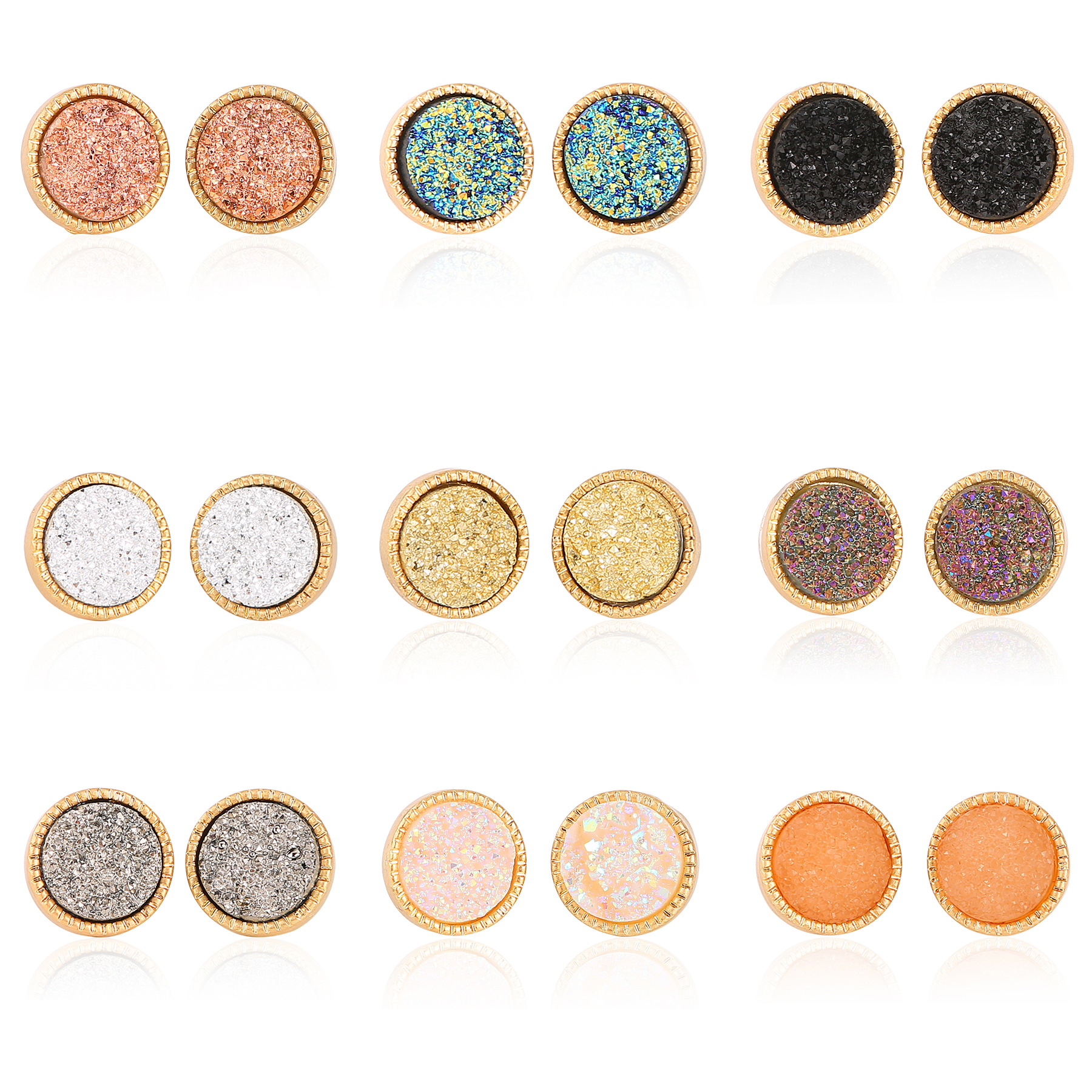 9 Color Pretty Cute Druzy Crystal Round Stud Earrings Set for Women Girl Fashion Delicate Pierced Jewelry