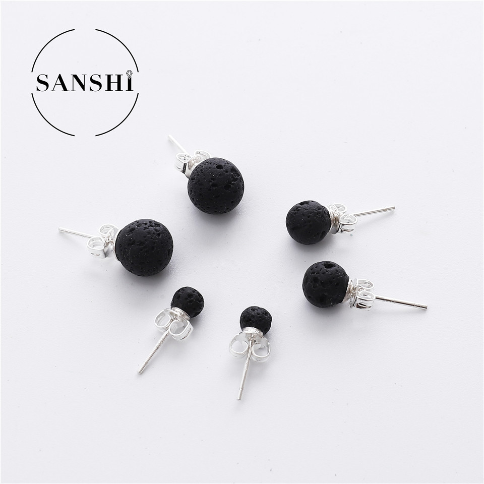 Fashion Punk Rock Essential Oil Diffuser Round Ball Earrings Studs Natural Black Lava Stones Stud Earring